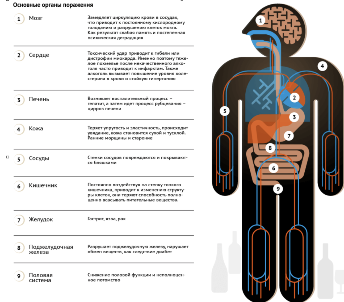 После приёма алкогольного напитка внутрь возрастает концентрация спирта в крови. Этанол проникает в печень, сердце, мозг и нарушает их нормальную работу.