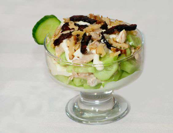 3.Смешать курицу, огурцы и сельдерей, полить майонезом, посыпать орехами. Сверху выложить чернослив.