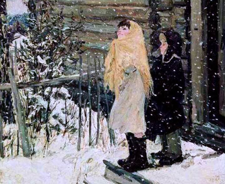 На картине А.А. Пластова «Первый снег» изображен первый день настоящей зимы и дети, которые радуясь первому снегу, выбежали на крыльцо.Девочка даже не успела одеться и выбежала в легком платье, накинув на голову большой платок и обув теплые валенки. Мальчик оделся теплее, на нем черный пуховик и шапка-ушанка. Дети с радостью и любопытством смотрели на первый снег.