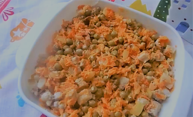 Открываем баночку горошка и сливаем всю жидкость. После этого, охлажденное мясо нарезаем кубиками. И наконец, складываем все ингредиенты в одну миску. Солим, перчим, добавляем немного сахара, уксуса ну и конечно же майонез. Тщательно перемешиваем и получаем просто отличный салат от которого тяжело оторваться!