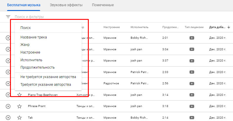 Искать музыку можно по названию трека, жанру, настроению, исполнителю и продолжительности.