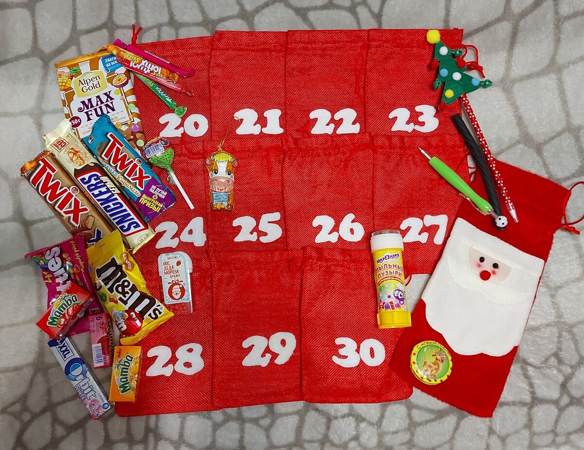 Можно и один сделать мешочек…или в любом супермаркете купить сапожок новогодний и каждое утро класть туда подарок…