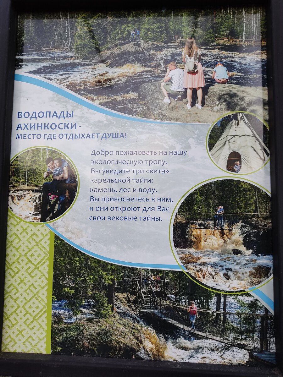 #21 #карелия Всех приветствую. Нагулявшись по горному парку Рускеала, пробыв целый день на свежем воздухе, мы изрядно устали, тем не менее проехать мимо водопада Ахинкоски на реке Тохмайоки мы не смогли. Мы под'ехали уже к вечеру. Не смотря на это, народа было достаточно много, но территория большая, поэтому мы могли немножко рассеяться и особо не мешать друг другу. Один из мостов над водоемом закрыт на ремонт. Мы пошли другой дорогой. Проложена тропа, несколько раз пересекающая реку. Вдоль нее поставлены фигурки забавных вымышленных персонажей. Для нашего удобства на развилках поставлены стрелочки. Было удивительно увидеть, как человек, постояв перед стрелочками, выбрал путь правой стрелки 🤭. Вечерело... Также вдоль дорожки поставлены информационные стенды, рассказывающие о природных богатствах Карелии. Сказочная избушка. Висячие мостики натянуты над красивыми и сложными местами. Понравилось, что на тропе есть представители парка - они следят за порядком. Селфи с красными носам