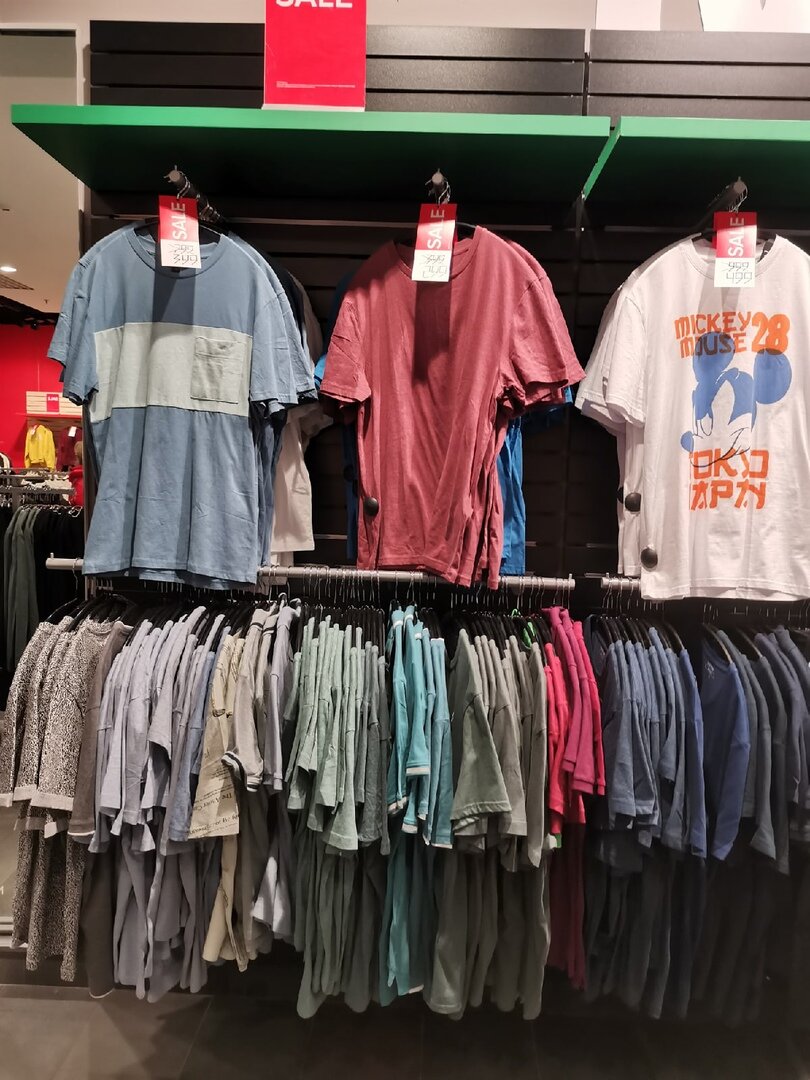 Стоимость футболок от 299 рублей, найти что-то дешевле не смогла, но и 300 рублей за новую вещь - это здорово. Сверху образцы для демонстрации, а нижний ряд - это то количество вещей, которое прошло через снижение цены. Поверьте, можно долго перебирать все вешалки, футболок много.