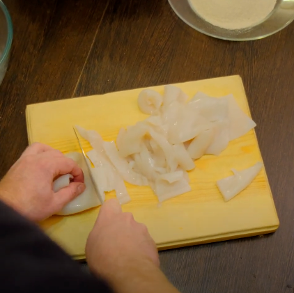 - Разморозим кальмаров. Если тушки неочищенные, тщательно их промоем и очистим от кожицы и пленок. Нарежем их на мелкие кусочки;