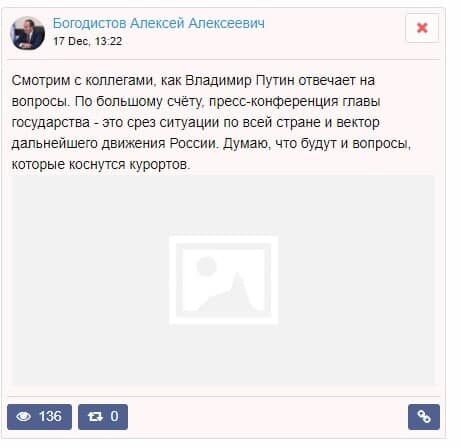 Поторопился Алексей Богодистов, согласен. В первой половине выдать пост со своим мнением о ситуации в стране – фактически как политолога. Не надо так, честно. А ведь главе государства могли задать вопрос о Кубани и, скажем, ситуации в Геленджике. Неудобненько бы вышло.