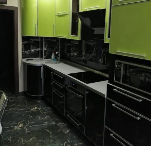 Первое, на что бросается взгляд, - это цвет. Сочетание светло-зеленого цвета с глубоким черным в принципе смотрится достаточно сочно и стильно. Для поклонников ярких кухонь такой дизайн, несомненно, понравится.