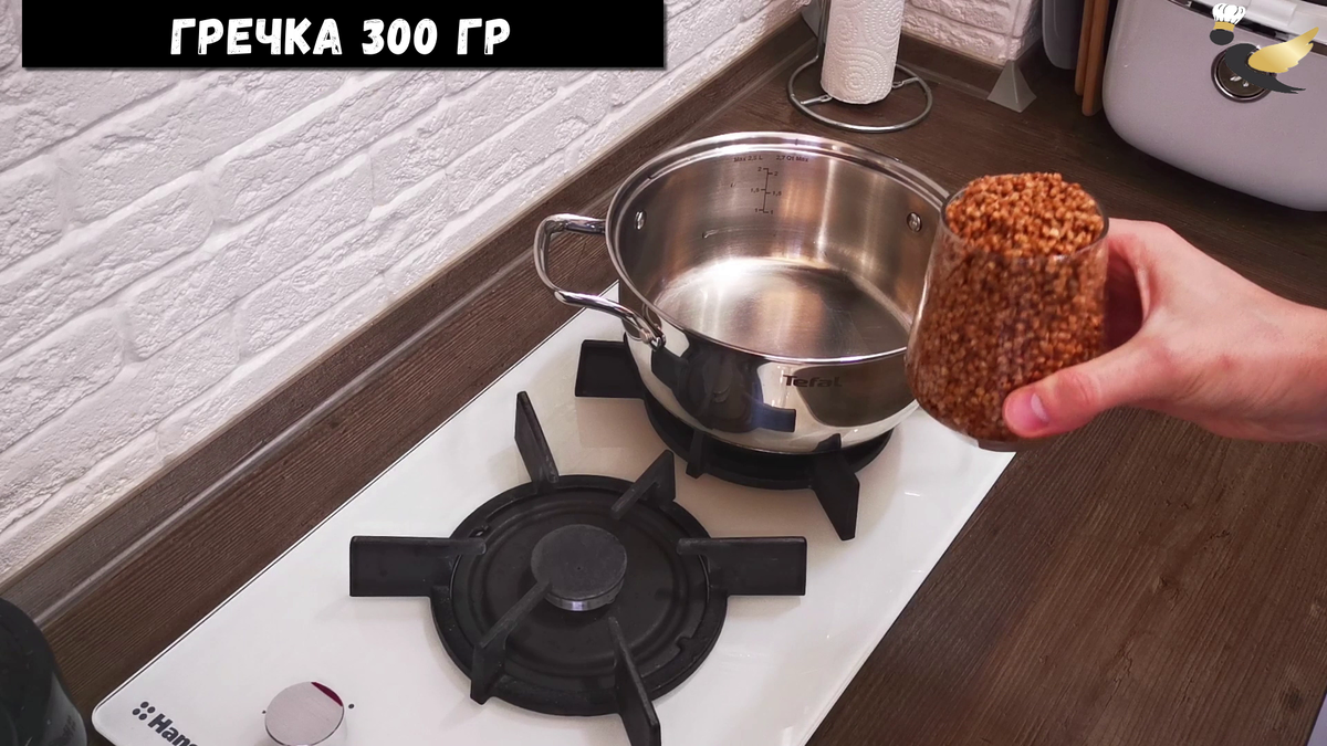 Для начала нужно сварить гречку. Я беру 300 грамм гречки, промываю ее, высыпаю в кастрюлю. Затем заливаю водой в пропорциях 2 к 1, (600 мл) чтобы гречка получилась рассыпчатой.