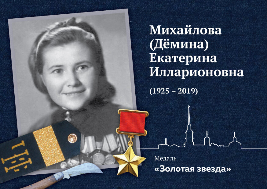 Окончив еще в родном Ленинграде курсы медсестер Красного Креста, Екатерина Илларионовна, скрыв свой возраст, стала оказывать помощь раненым уже в первые дни войны. Там же под Смоленском была тяжело ранена и проходила лечение в госпиталях тыла. После непродолжительной служба на санитарном транспорте, она была зачислена в отдельный батальон морской пехоты. В его составе Екатерина Михайловна прошла от Кавказа до Австрии, была трижды ранена, а количество спасенных в боях исчислялось сотнями. В бою она действовала не только как медик, но и проявляла бесстрашие, выполняя труднейшие боевые задачи, не уступая мужчинам в храбрости и сноровке. Она была награждена орденом Ленина, двумя орденами Красного Знамени, орденом Отечественной войны 1-й и 2-й степени, медалью «За отвагу», другими медалями, а также удостоена медали Флоренс Найтингейл Международного Комитета Красного Креста. Дважды Екатерину Михайловну представляли к высшей награде – Героя Советского Союза, но каждый раз в верховных инстанциях это отвергали, вероятно, ставя под сомнение реальность того, что все это могла сделать женщина. И лишь в 1990 году «награда нашла Героя», что всем нам дает пример, что иногда справедливость все же торжествует…