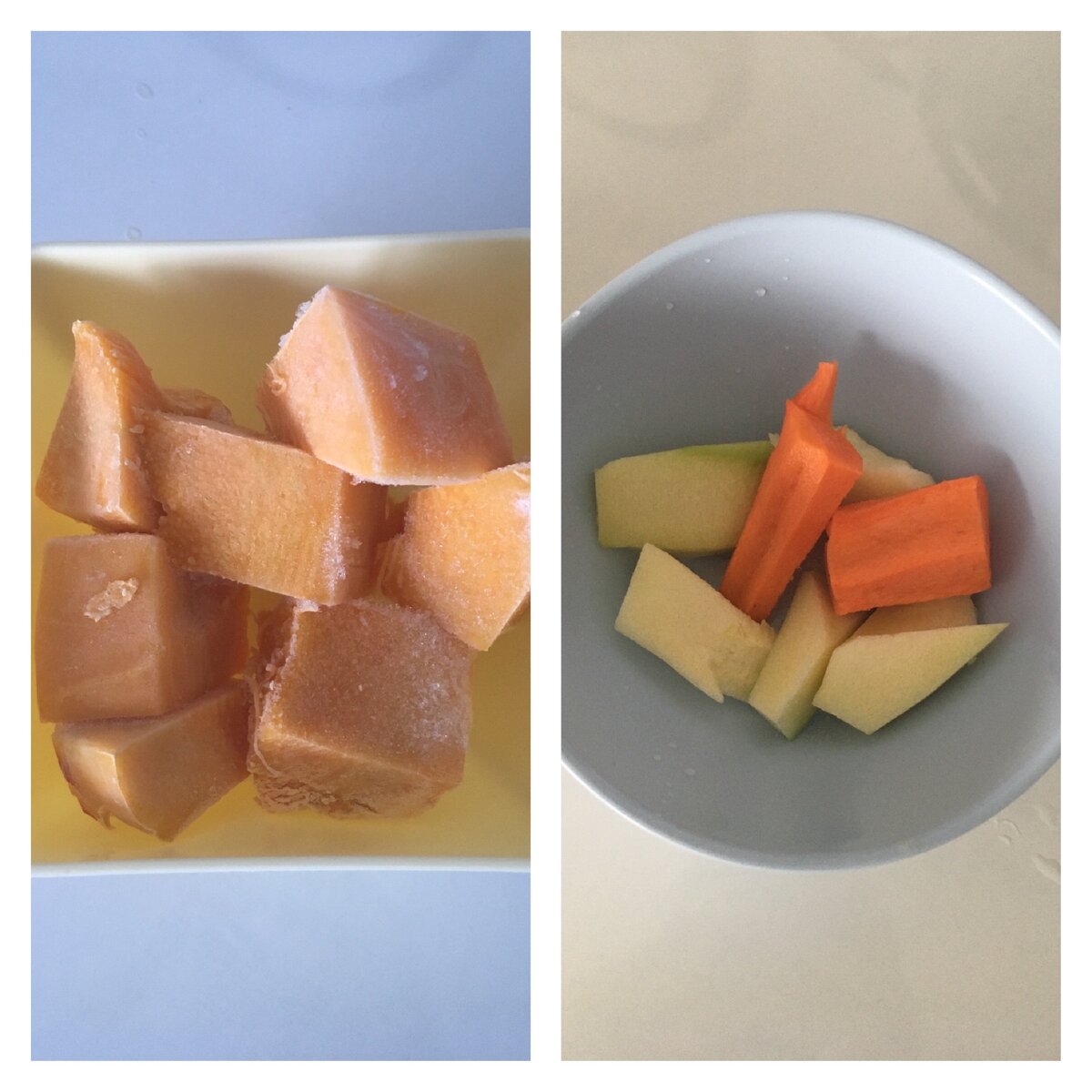 Моем и очищаем овощи. Тыква у меня уже заготовленная заранее. Я не размораживаю ее перед варкой, нет необходимости.