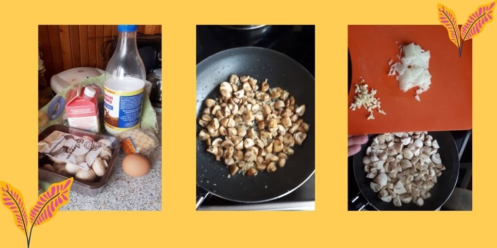 Обжариваем грибы, добавляем лук и чеснок, соль и перец. Откладываем готовую начинку в сторону.