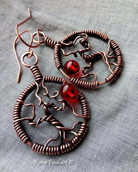 Серьги-оберег Древо Желаний с красным кварцем в меди