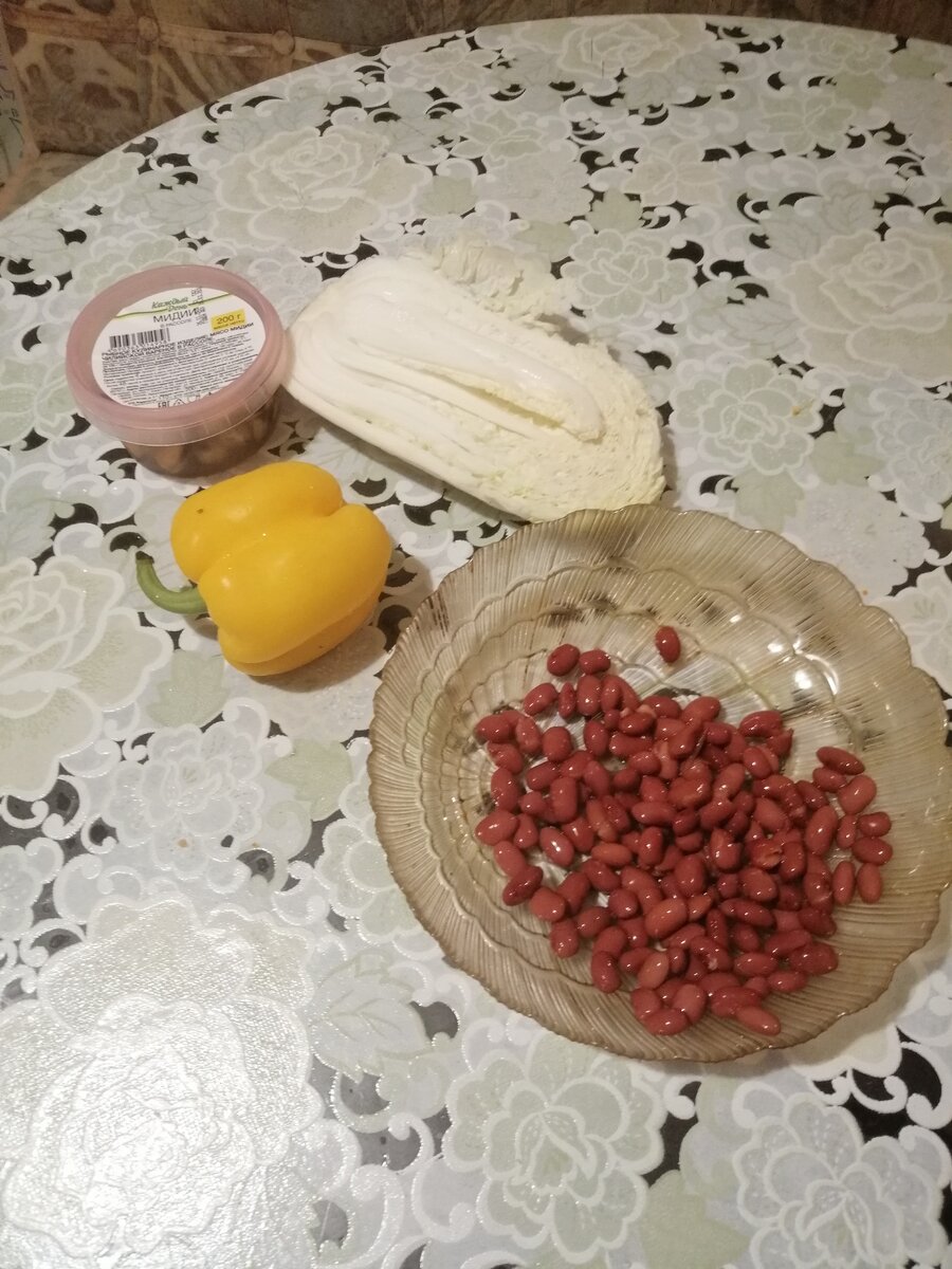 Нам понадобятся банка консервированной фасоли, мидии, 1 сладкий перец, пекинская капуста и майонез.