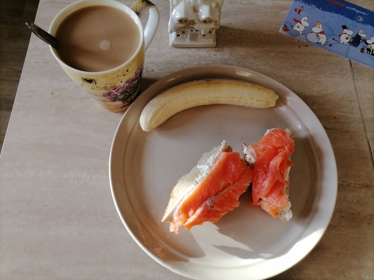 Завтрак: Кофе с молоком, банан и два бутерброда с твороженным сыром и форелью.