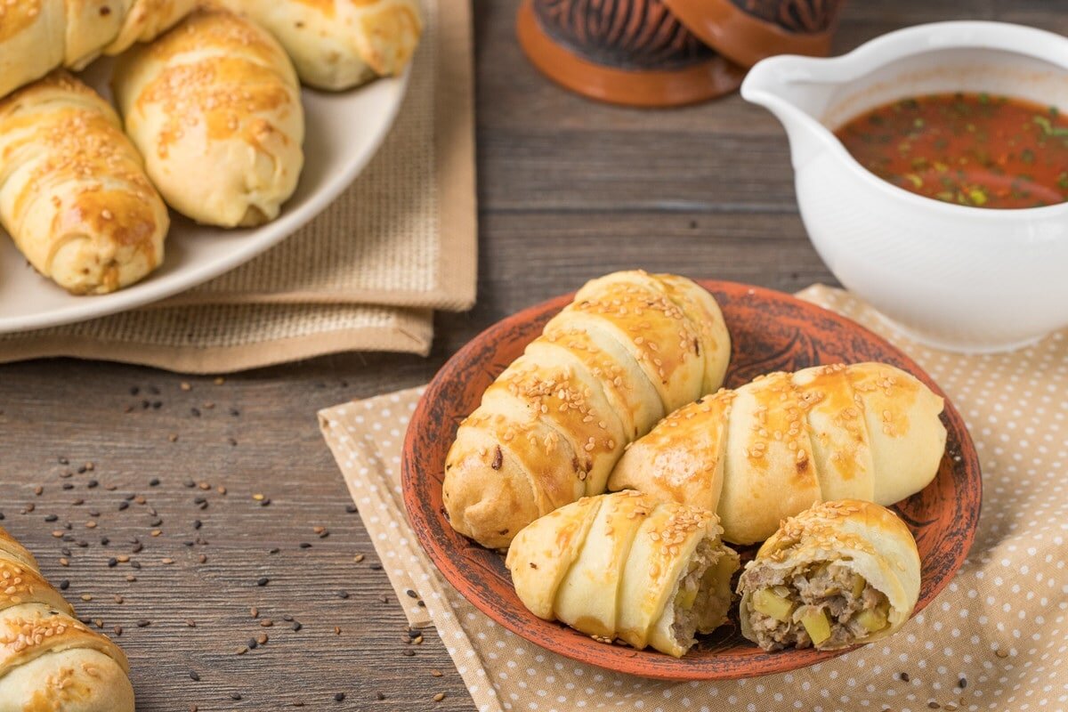 Тесто выложите на присыпанную мукой поверхность и раскатайте довольно тонко. Нарежьте длинными полосками средней ширины. Чтобы турецкая самса в домашних условиях смотрелась более красиво, можно нарезать тесто при помощи фигурного ножа.