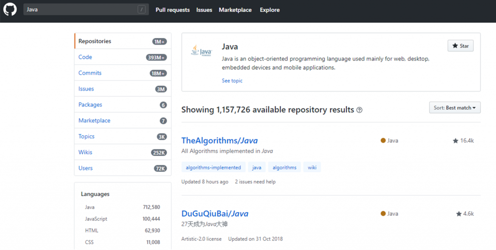 Если вам нужен определенный специалист, например, Java-разработчик, то если вы пропишете слово «Java» в поиске, то GitHub выполнит поиск по таким категориям: