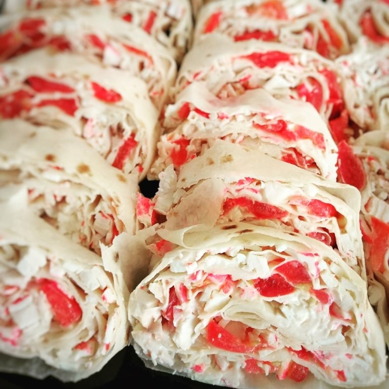1.Крабовые палочки натереть на средней терке. Часть оставить для декора. 2.Смешать тертые крабовые палочки, рикотту, сок лимона и майонез, массу посолить и приправить чесноком (выдавить через пресс или натереть на средней терке.3.Тесто разморозить, сливочное масло растопить. Листы фило сложить пополам, смазать сливочным маслом. 4.Открытый край рулетиков подогнуть, в центр выложить сырно-крабовую