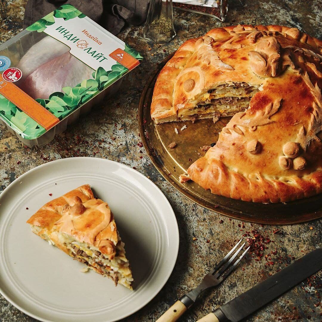Края нижней лепешки смазываем взбитым яйцом и накрываем второй дрожжевой лепешкой, фигурно защипывая края. Сверху делаем фигурные надрезы, чтобы выходил пар. Выпекаем при 180° 45 минут, пока индюшник не станет золотисто-коричневым.