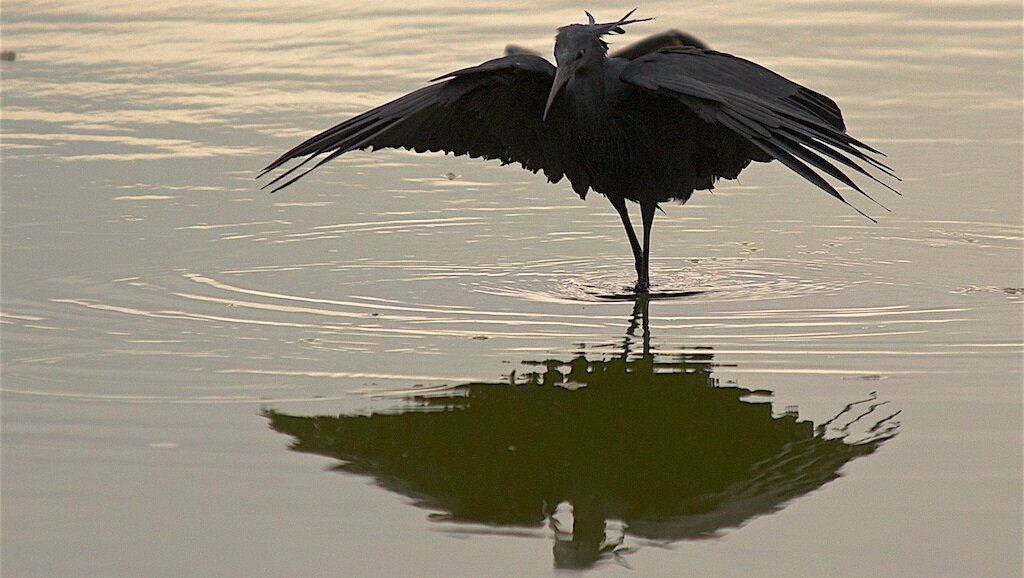 Черная цапля отличается не только своим окрасом, но и необычным способом добычи пропитания.