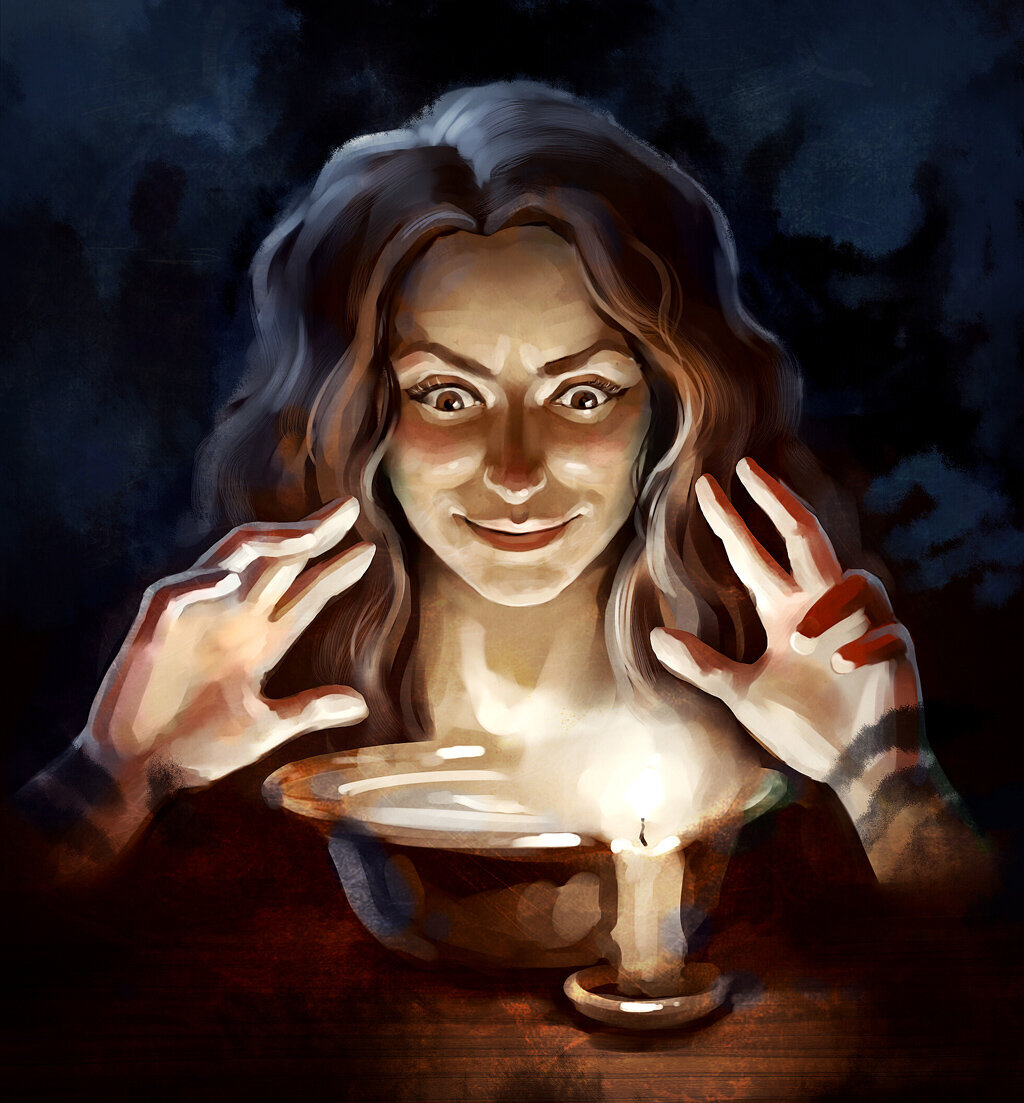 Домовой подошёл и провел над грудью девушки рукой. Я увидела сердце, легкое, трахею и всё к ним прилегающее, но между сердцем и трахеей, почти на самой поверхности я увидела мутное пятно.