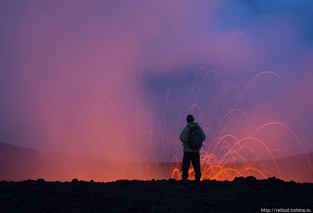Подойдя к самому краю становится жарко и немного страшно, ведь бурлящий всего в 100 метрах под ногами котел раскаленной лавы периодически взрывается и лава взлетает метров на 30 выше нас. Каждый взрыв сопровождается ощутимым давлением на уши от взрывной волны и тогда ты в полной мере ощущаешь всю мощь Земли!!!.На следующий день мы снова пришли полюбоваться этим зрелищем и нам стало немного не по себе от увиденного, что почти два метра склона, где мы вчера стояли, обвалилось в кратер.