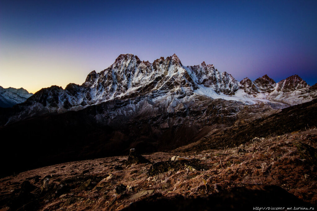 Опять темнота… Опять тишина и уже привычка вставать в 3 ночи, собираться при свете фонарика, выглядывать в запотевшее окно в поисках погоды. Предыдущая ночь оказалась невероятно счастливой: удалось взять отдельный номер и поспать в одиночестве на втором этаже, где ровно половина комнаты – окна. Холодно, конечно было, зато какое счастье, лежать в относительном тепле в спальнике, под двумя одеялами и впитывать звёзды. А как хорошо там днём... В залитой солнцем комнате, с видом на Гокио и прекрасные горы. И всё это за 80р/ сутки. Я же говорю, Рай, а не место! Подпитавшись очередным чокопаем, вздувшимся из-за разницы высот и давлений почти как воздушный шарик, спускаюсь вниз. Идём!Своим ровным темпом обгоняем китайскую пару, которая идёт в «челночном стиле». Поднявшись где-то на половину, видим тоненькую рваную ниточку фонариков, зигзагом протянувшуюся от лоджей до 30 минут отрыва после нас. Чуть позже нас застаёт рассвет, и окружающее место начинает проявляться во всей своей мистичности и странности. Огромное нагромождение разных камней, поставленных вертикально и перекрытых горизонтальными, которые держатся на неприменимых здесь законах равновесия… До сих пор не понимаю, как при тех ветрах, что там гуляют, эти горизонтальные пластины ещё не улетели стремительными бумерангами. Весь мир вокруг начинает приобретать очертания, насыщаться розовато-жёлтыми цветами рассвета: на фиолетовом полотне неба расцветают нежные персики.В одном участке тропы гора имеет ярко-выраженную округлую форму. Вдруг, ты слышишь непонятный резкий низкочастотный свист, как в стереонаушниках, быстро проносящийся где-то за спиной справа налево... Быстрее оглядываешься и успеваешь краем глаза зацепить стаю птиц, летящую как одно целое, в одной траектории, близко друг к другу, как в одном теле. Эти птицы сопровождали гору ещё какое-то время, быстро облетая его по кругу. Дыхание уже привыкло к такому воздуху, привыкло к тому, что постоянно нужно идти вверх, и ты спокойно выходишь на вершину, минут за 20 до рассвета. Те, кто уже дошёл наверх выглядывают из-под флажков со встречными поздравлениями: поздравляю, мисс 5300! Потом всеобщее ликование, объятья, радостные глаза и улыбки. Люди на этой горе вообще проявляют своё счастье как-то по-особенному. То ли дело в эйфории от некоторой гипоксии, то ли правда радуются. Кто-то стоит на голове, и просит сфотографировать его с Эверестом между ног в этой стойке; кто-то делает сотни селфи; кто-то поёт песни со своим местным гидом; кто-то как я вызывает у вновь прибывших ощущение того, что эта девочка в платье тут живёт и работает аниматором, кто-то… хаос, настоящий хаос. Только спустя какое-то время, глядя вниз ты замечаешь, что тропа превратилась в настоящую транспортную магистраль. Столько народу на одной горе, в одном месте я никогда не видела. Рассматриваем одну из самых знаменитых панорам Гималаев, этот венок из каменных цветов, венчающий голову нашей земли…Места, откуда мы пришли, и перевал, через который ещё придётся идти. Ух! Внушительно. Горы, Время летит незаметно, а после обеда у нас переход через огромный ледник Нгозумба в местечко Дрогнак, откуда предстоит выход на перевал Чо Ла. По пути вниз останавливаемся на ярко-жёлтой выжженной очень горячим солнцем поляне. Глаза не хотят идти дальше, они хотят остаться здесь, чтобы упас
