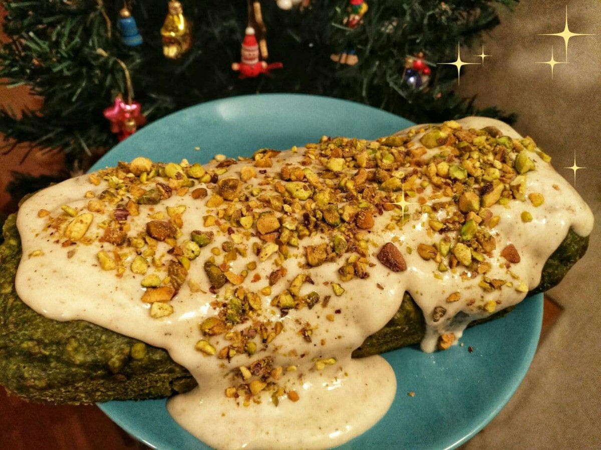 Кекс не пахнет корицей и кардамоном, столь привычными для декабря. Зато он зеленый! Смотришь — и в голове сразу "Здравствуй, ёлка, Новый год". К тому же он получается очень плотным. А когда, как ни зимой, хочется на время забыть про безе и легкие муссы?
