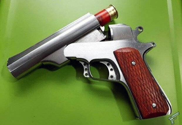 Сам пистолет может иметь разные формы. Основное в нём – это ствол, подходящий под патрон 12 калибра. Наиболее популярная модель похожа на американский Кольт М1911, а главное, чтобы он был блестящий. Хотя оружие и похоже на пистолет, но заряжают его как охотничье ружьё – переломив ствол.