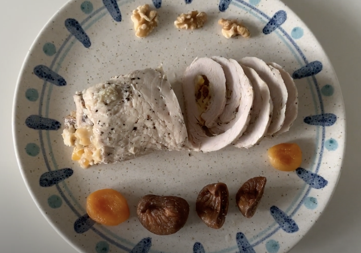 Рулет из филе индейки, сухофруктов и сыра можно подавать как красивое блюдо, в горячем и холодном виде. К новогоднему столу вы можете приготовить его заранее и подать в качестве оригинальной закуски.