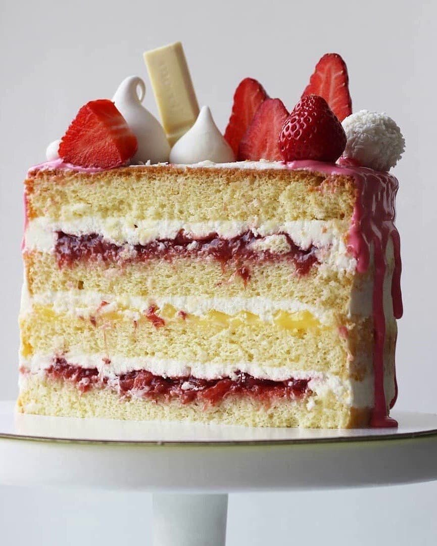 Воздушный бисквит с лёгким ароматом лимона, сладкая клубничная начинка, сливочные облака крема и умопомрачительный яркий вкус лимонного курда.