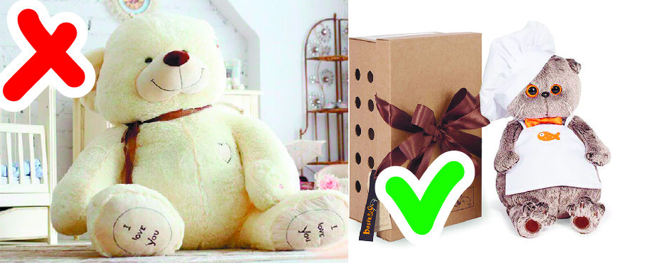 Вместо большой "ноунейм" мягкой игрушки лучше подарить качественную небольшую. Мои дети, например, в восторге от "Басиков", другие мягкие игрушки почти не достают.