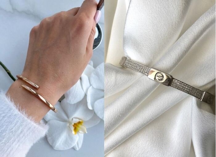 Тонкий браслет, который визуально очень похож на обод, но с открытой внутренней частью, называется незамкнутый браслет. Разработанные в овальной или круглой форме, он являются одними из самых объемных браслетов и создают иллюзию тонкого запястья. Например, «гвоздик» или ободок — незаменимое украшение на каждый день.