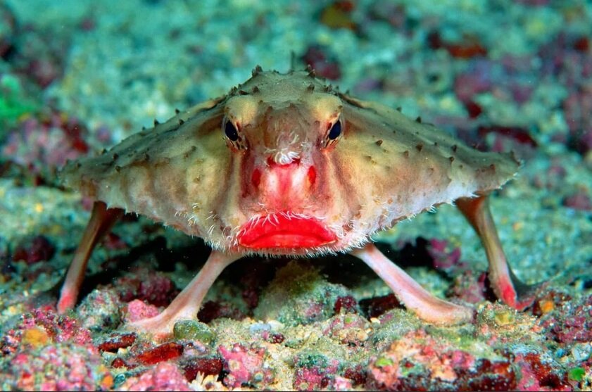 Эта рыба с ярко «накрашенными» губами обитает у побережья Галапогосских островов. Нетопырь Дарвина не плавает, а ходит по дну океана с помощью плавников. Питается в основном малюсками, мелкими рыбами и ракообразными.