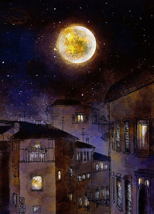 Во дворе было темно и безлюдно, светился окнами наш дом, под ногами хрустел снежок, я шла, уткнувшись носом в шарф - мне было очень стыдно за своё поведение. Папа что-то спросил, я подняла голову, чтобы ответить и тут увидела на небе полную сияющую луну, похожую на кусочек сливочного масла, который обычно плавал у меня в каше... и мне захотелось съесть её, ведь я так и не поужинала и уже ощущала лёгкий голод. Я сказала об этом папе, на что он ответил, что " луну есть нельзя" и стал рассказывать про луну, звёзды и другие планеты... А я опять опустила голову, мне опять стало очень стыдно. А на следующий день мы с папой пошли в ресторан)