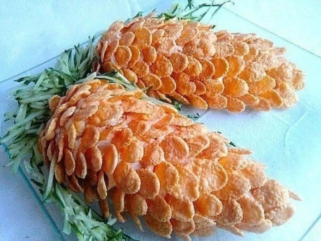 - Выложить всё на блюдо формируя шишки и украшая сверху хлопьями, как на рисунке.