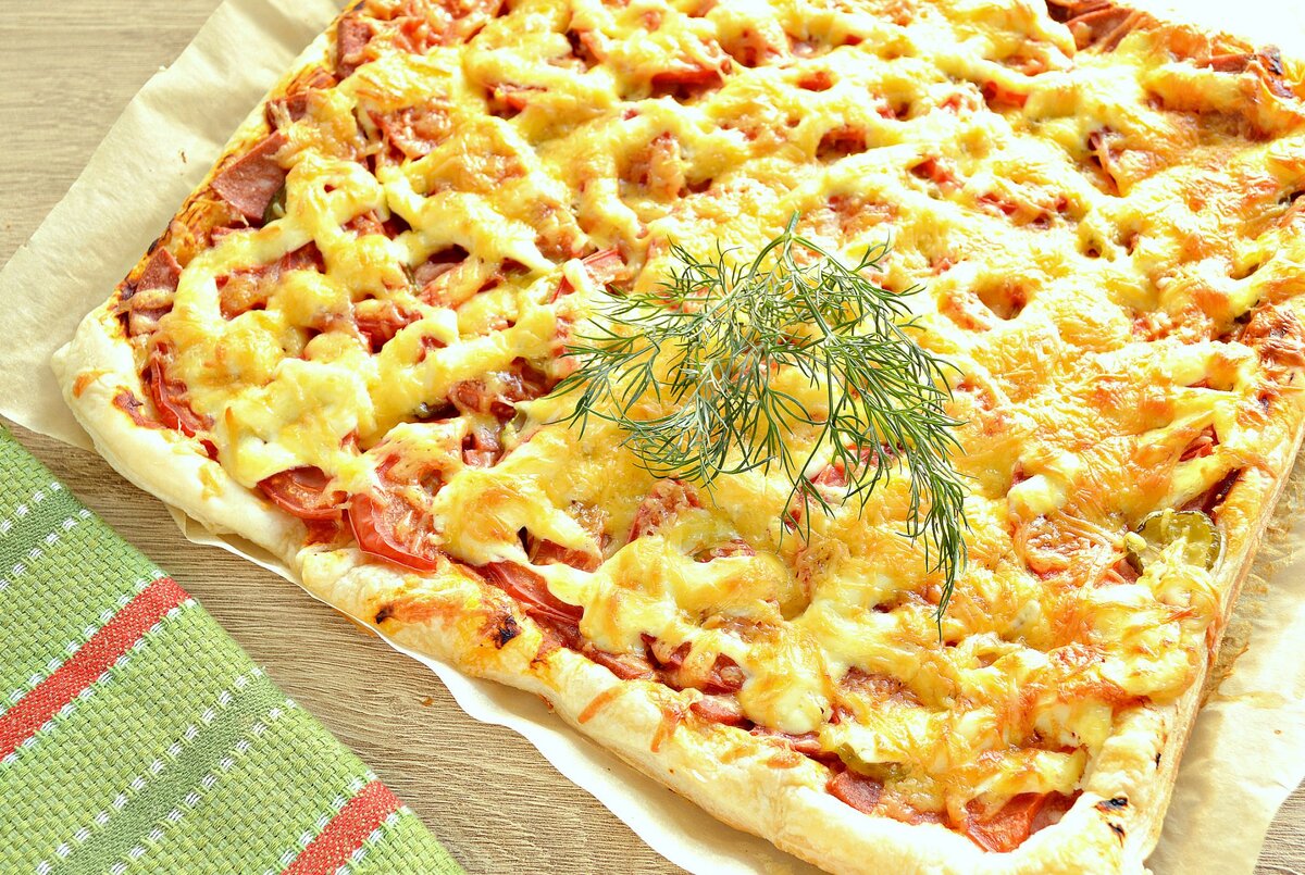 Например, большой популярностью пользуется пицца, приготовленная на слоеном тесте.