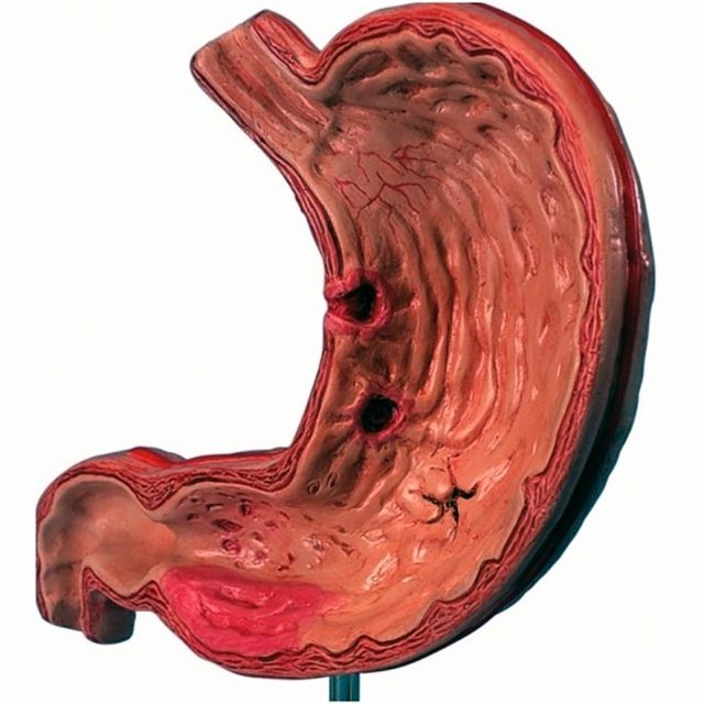 · инфицирование слизистой оболочки желудка Helicobacter pylori. Эта бактерия, внедряясь в слой слизи, покрывающий внутри стенку органа, прикрепляется к эпителиальным клеткам и проникает в крипты и железы желудка, разрушая таким образом защитный слой слизистой оболочки. Внедрение Helicobacter pylori инициирует воспалительный процесс собственной пластинки слизистой оболочки желудка, что, в свою очередь, приводит к несостоятельности слизисто-бикарбонатного буфера и способствует угнетению репаративных процессов. Кроме того, уреаза, вырабатываемая указанным микроорганизмом, создает вокруг него защитный слой и тем самым тормозит процесс фагоцитоза;