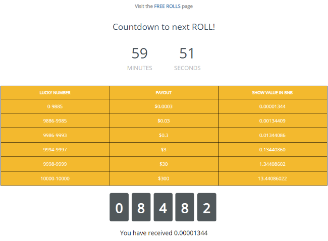 - Нажмите на кнопку ROLL, чтобы получить бесплатный BinanceCoin. Количество бесплатных BinanceCoin, которое вы получите, будет зависеть от номера, который вы выплачиваете и выплачиваете в соответствии с таблицей выплат ниже. Вы можете возвращаться и играть каждый час, чтобы каждый раз выигрывать дополнительные бесплатные BNB!