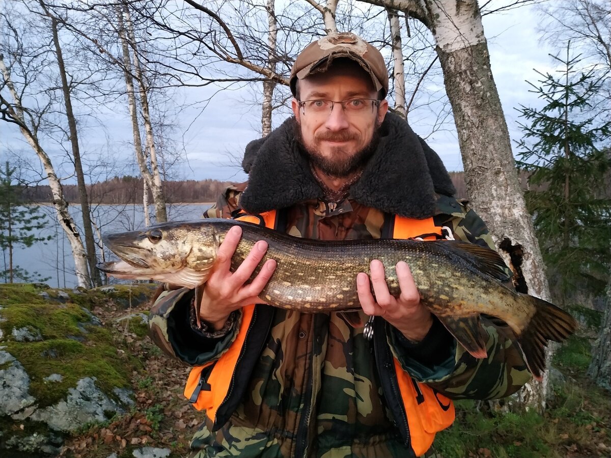 Даю щуке уйти, подтягиваю, снова даю уйти, подтягиваю... С каждым разом сопротивляется всё меньше, вот уже лежит вдоль лодки, можно увидеть её целиком: чёрная толстая спина в цвет осенней воды. Проверяю, насколько устала: даю лёгкий щелбан по носу – встрепенулась, снова рванула, но уже не заныривает, подтягиваю к лодке, подношу руку – не реагирует. Завожу подсак с хвоста, воблер в районе головы цепляется за него, но это уже не страшно, переваливаю через борт – победа! Трофей, добытый по науке. Конечно, без везения не обошлось, но надеюсь, что решающим, всё-таки, было умение. Всем удачи и интересной рыбалки!