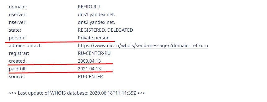 В запросе Whois по названию сайта REFRO.RU содержатся сведения о том, что он был создан в апреле 2009, оплачен до 2021 года, владелец предпочел скрыть свои данные, а сообщение ему можно отправить через ссылку на личный кабинет регистратора RU CENTER. Файлы находятся на DNS-серверах Яндекса.
