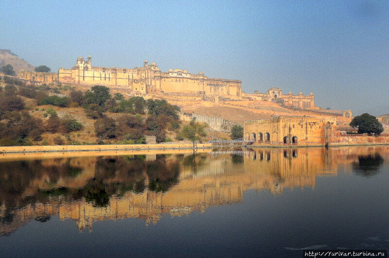 Подъехав к крепости утром, стоит остановиться внизу – у озера Maotha. Отсюда открывается самый лучший вид на это архитектурное чудо, расположившееся метров на сто-сто пятьдесят выше на склонах горы Чил-ка-Тила (Холм Орлов). Этот форт наряду с фортом Джайгарх, расположенным непосредственно над ним рассматривается как единый комплекс, поскольку эти два сооружения хорошо связаны подземными ходами.Крепость-форт Амбер ранним утром