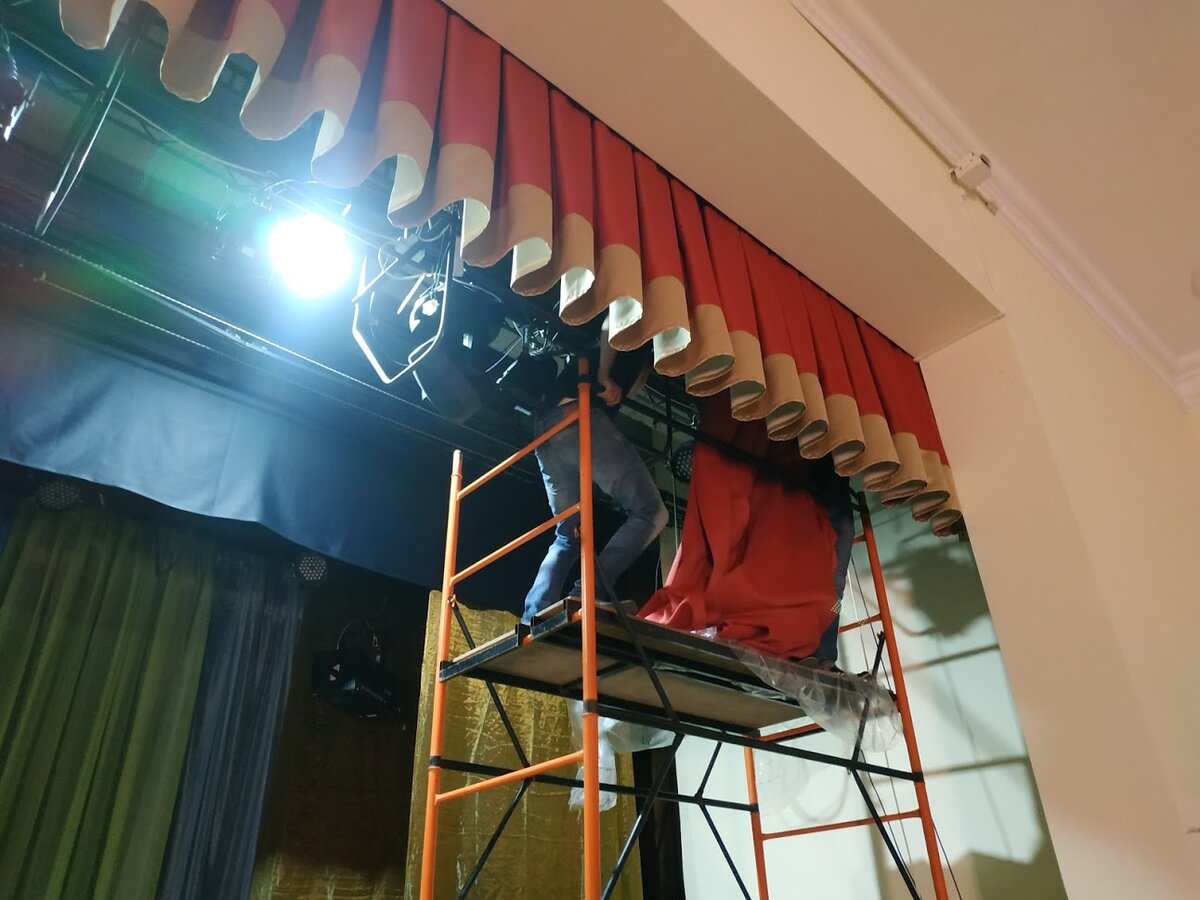 И да! Пожалуй, вывешивание занавеса можно назвать вторым по сложности мероприятием после его разработки и самого пошива, где участвуют и дизайнеры, и мастера швейного производства!