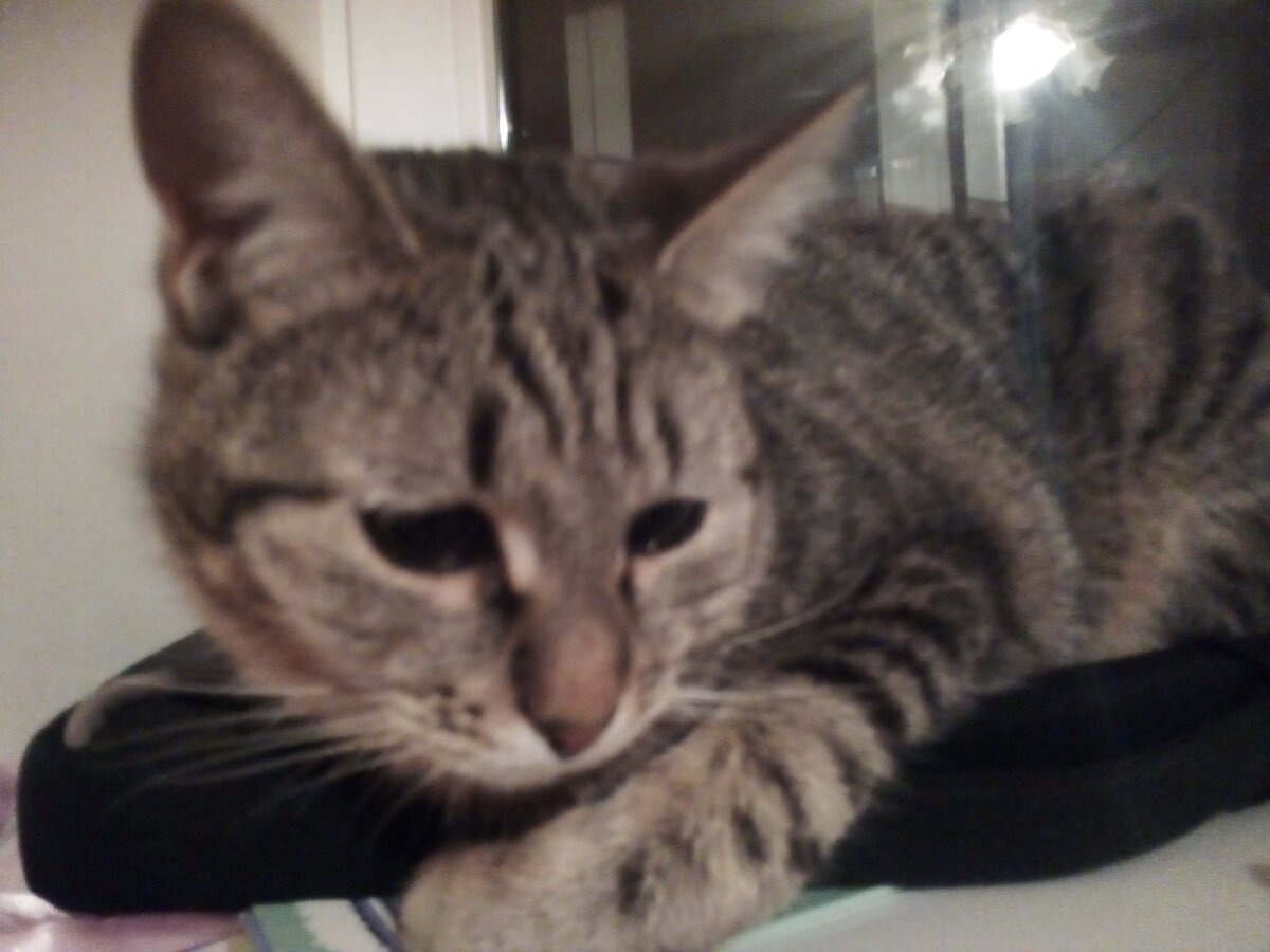 Финик другой, он очень нежный. После прогулки мы его покормили и спать уложили. От меня не отходит. Шлейку кот в зубах отнес под ванну (спрятал). К входной двери не побежал как обычно (когда муж пришёл с работы).