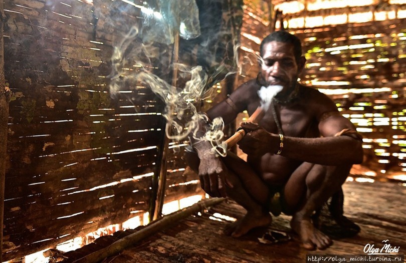 ДикариПоначалу жители деревни относились к нам настороженно, близко не подпускали. Только дети следовали за нами повсюду. Просыпаясь, мы неизменно замечали милые мордашки, заглядывающие в нашу хибару и прогоняющие от входа большую свинью Бади, которая так и норовила добраться до наших съестных запасов. Вообще, дети к нам очень тянулись. Взрослые члены племени практически не проявляют к младшим ласки, нежности, внимания. А мы общались с ними, показывали им на iPad мультики и примитивные компьютерные игры.Между прочим, видя все это, радовались и хохотали не только маленькие члены племени, но и взрослые дикари.Раз в несколько дней мы ходили с местными женщинами на поиски пищи животного происхождения, по пути собирая гигантские дикие огурцы и съедобных насекомых. Я всегда удивлялась тому, как лихо женщины клана ловят змей и ящериц. Вечером эти «лакомства» подавались к импровизированному столу на «тарелочках» из пальмовых листьев. Ну а на десерт вместо молока и сладостей наши папуасы ели гигантских личинок «улат сагу» (ulat sagu — английское название, noun — на языке короваев). Этих личинок аборигены собирают под корой саговых пальм, срубленных тремя месяцами раньше. Таким образом, деревья становятся своеобразной фермой для выращивания насекомых.Олфит уговаривает нас попробовать лакомство, утверждая, что черви по вкусу напоминают кокосовую мякоть или даже белый шоколад. Заглатывать личинок нужно «с хвоста», предварительно откусив голову, иначе червяк способен больно укусить за язык. Я на это решиться не могу, а вот моя смелая Светлана без труда кладет одного в рот. Говорит, что по вкусу — явно не шоколад и даже не молоко, а слегка сладковатая, водянистая масса, довольно неприятная. Но наши папуасы уплетают их сырыми и жареными за обе щеки, а заодно едят и других жуков, с крылышками и лапками, называемых kheipt. И все же, по мнению самих дикарей, наиболее вкусные личинки — noun, так как эти черви питаются молоком саговой пальмы.Саговая пальма — главное дерево для племени короваи. Аборигены используют ее для строительства хижин и делают из пальмовых листьев женские юбки cawat. Кроме того, мякоть пальмы измельчают в труху при помощи тупых дубинок, затем промывают дождевой водой, собранной прямо с земли, и она превращается в вязкую массу, напоминающую мокрую муку. Из нее короваи пекут лепешки. Любопытно, что возраст пальмы, пригодной для еды, должен составлять не менее 20 лет.Без преувеличения, продолжительность жизни деревни напрямую зависит от наличия саговых деревьев в районе. Как только туземцы вырубают все пальмы в округе, то подыскивается место для строительства нового поселения. Как правило, местные жители делают это с периодичностью раз в семь лет. Честно признаюсь, что избежать поедания предложенного лакомства мне не удалось. На вкус лепешки напоминают жареную муку.Мясо крупных животных, в том числе домашних, короваи едят редко. Во-первых, не так легко в лесу поймать дичь, а во-вторых, свинья на местном рынке стоит около 800–5000 долларов США. Сумма для аборигенов неподъемная.На шестой день проживания в клане мы услышали историю одного юноши, который уже несколько лет влюблен в местную девушку, но не в состоянии заплатить за нее выкуп, состоящий из змеи, зверька кускуса, ожерелья из собачьих зубов и свиньи. Пожалев юношу, мы скинулись на самого д