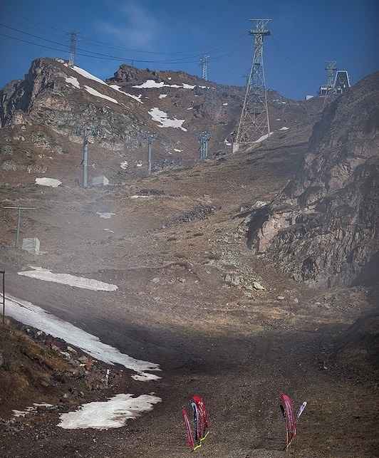 На 7 утра был назначен старт главного забега — скоростного восхождения на Эльбрус. Мы стартовали с поляны Азау в классе PRO, параллельно с этим с бочек выбежала группа "любителей". Странные эти любители — большинство опытных альпинистов и мультиспортсменов стартовали с бочек. У меня же хватило наглости дернутся прямо с Азау и попробовать свои силы оттуда. Многие, кто стартанул снизу отметили, что шлось еще легче, чем позавчера, наверно из-за замерзшего грунта. Действительно, до бочек с Азау мы просто летели, и казалось, что сегодня все получится легко и не принужденно..Марко на финише