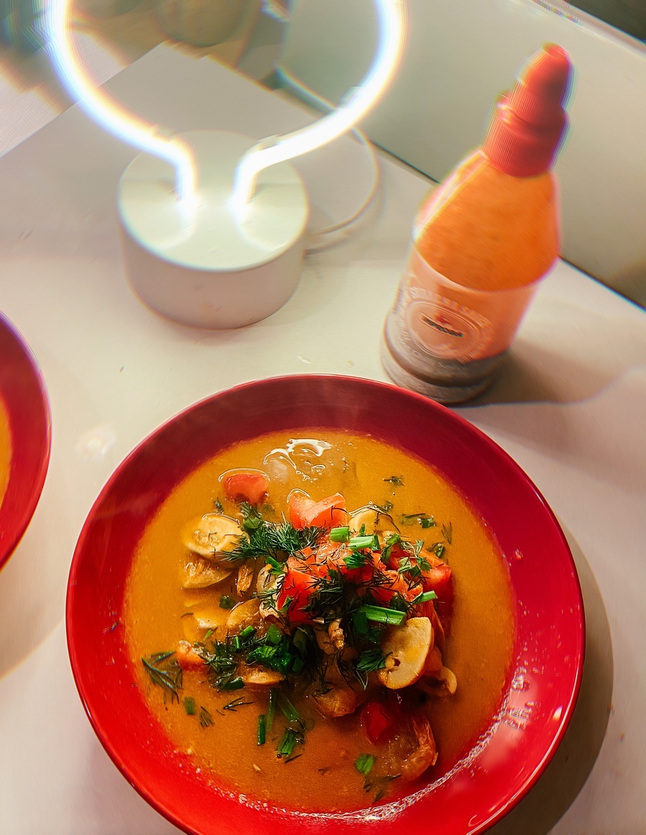 1.Обжарить на сильном огне в минимальном количестве масла чеснок,имбирь,цедру лимона в течении одной минуты,добавить пасту для Том Яма.