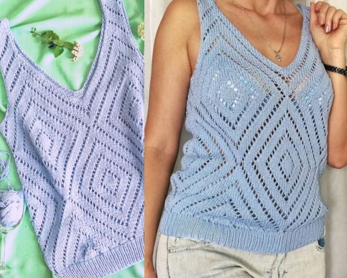 Сегодня я хочу представить вашему вниманию интересный геометрический ажурный узор спицами, которым можно связать шикарный свитерок или маечку на теплое время года.