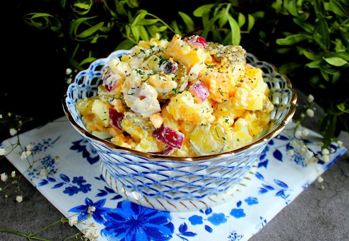 Отправьте к картошке и яйцам маринованные огурчики.