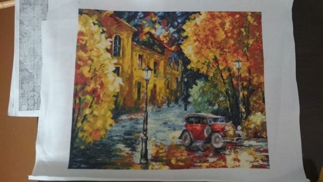 Конечно, все фото это процесс, после все было постирано и отутюжено, и передано заказчице. Даже не знаю оформила ли она ее. Но то что она довольна, это факт. Она тоже поклонница Л. Афремова.