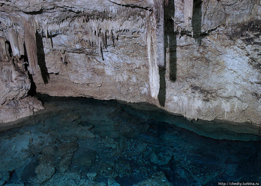Вся эта масса воды, по своим запасам значительно превышающая любую реку или озеро на нашей планете, медленно двигается в северо-восточном направлении, в сторону общего понижения платформы и стекает в Карибское море. Кое где она образует туннели по которым текут подземные реки. Уровень подземных вод не постоянен, исторически случались моменты когда туннели переполнялись и начиналось изливание подземных вод на поверхность, возникали артезианские (свободно фонтанирующие) источники. Такие источники легко размывали мягкий рифовый известняк и в точках выходов образовывали пещеры близкие к поверхности земли. Со временем крыши пещер обрушались (не всегда) образуя красивые круглые колодцы большого диаметра. Священный синот Майя. Фото из интернета.
